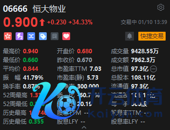 1月10日音书,港股恒大物业股价大涨逾34%,报0.9港元,成交额7962.3万港元kaiyun官方网站登录入口,总市值97.3亿港元。
