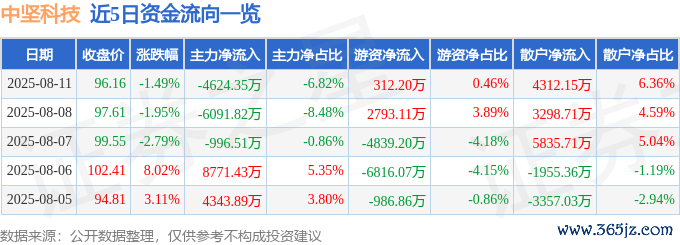8月11日的资金流向数据方面,主力资金净流出4624.35万元,占总成交额6.82%,游资资金净流入312.2万元,占总成交额0.46%,散户资金净流入4312.15万元,占总成交额6.36%。