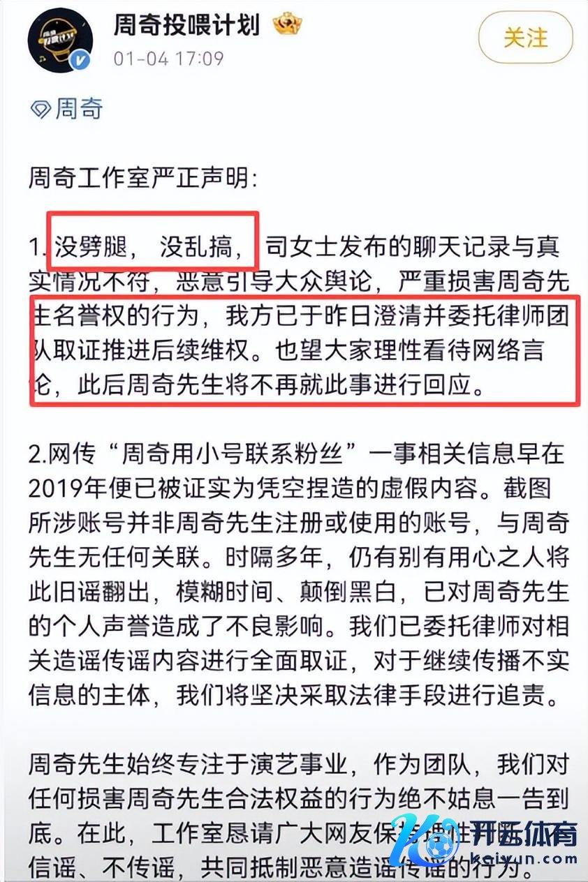 眼看公论愈演愈烈,周奇责任室在 1 月 4 日下昼火速发声,用 “没劈叉,没乱搞” 八个字给出中枢恢复。