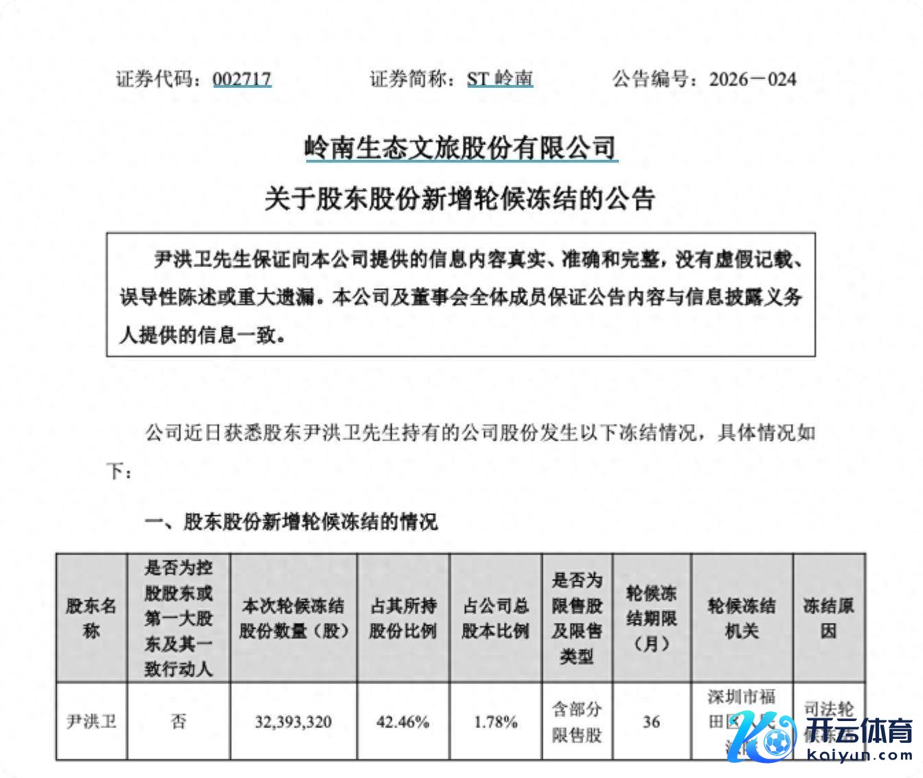 3月11日晚间,ST岭南(002717)一则公告,再次将这家生态文旅上市公司推至聚光灯下。公司原控股股东、现任联席董事长兼总裁尹洪卫所捏股份新增一笔轮候冻结,触及数目约3239.33万股,占其个东说念主捏股的42.46%,施行方为深圳市福田区东说念主民法院,冻结期限长达36个月。