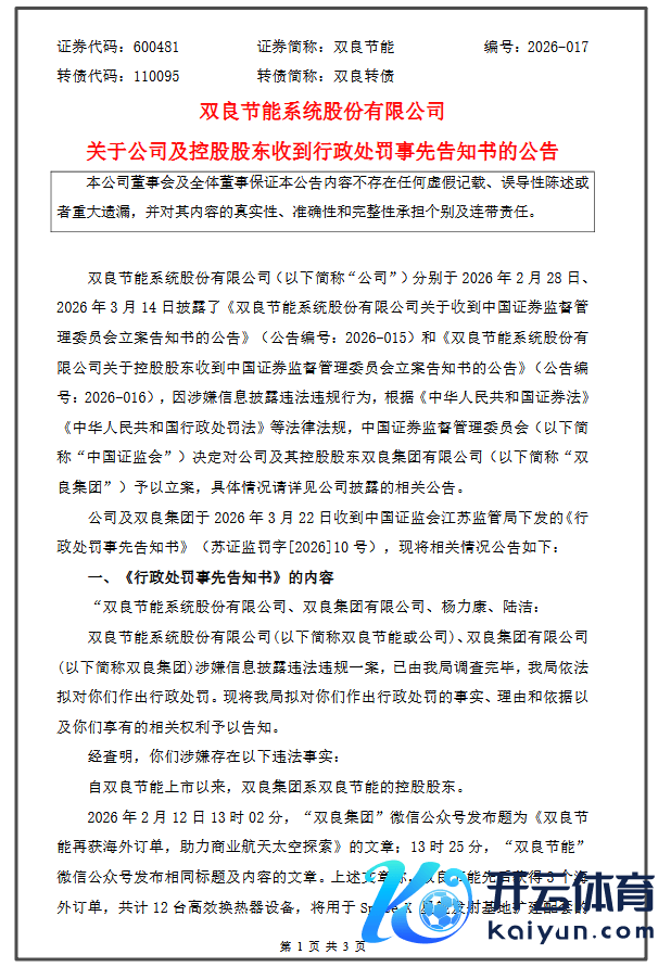 3月23日,双良节能系统股份有限公司发布公告称,3月22日收到中国证监会江苏监管局下发的《行政处罚预预知告书》。